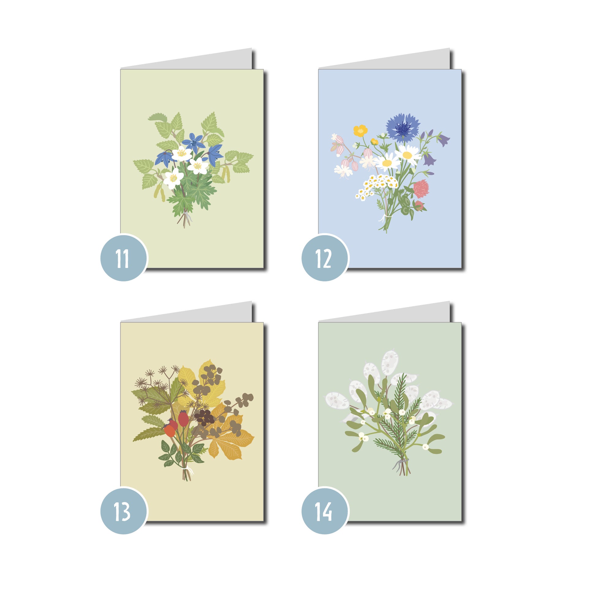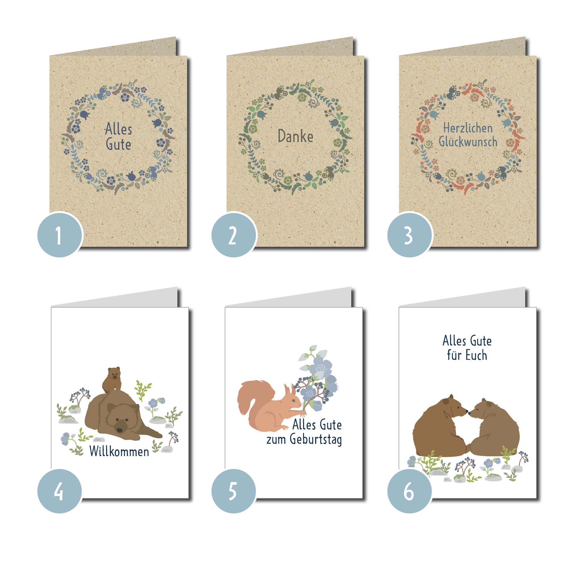 Die Karten 1 – 3 bestehen aus Graspapierkarton mit ca. 50 % Grasfasern und 50 % FSC-Zellstoffen. Alle anderen Karten sind auf 100% Recyclingkarton gedruckt.