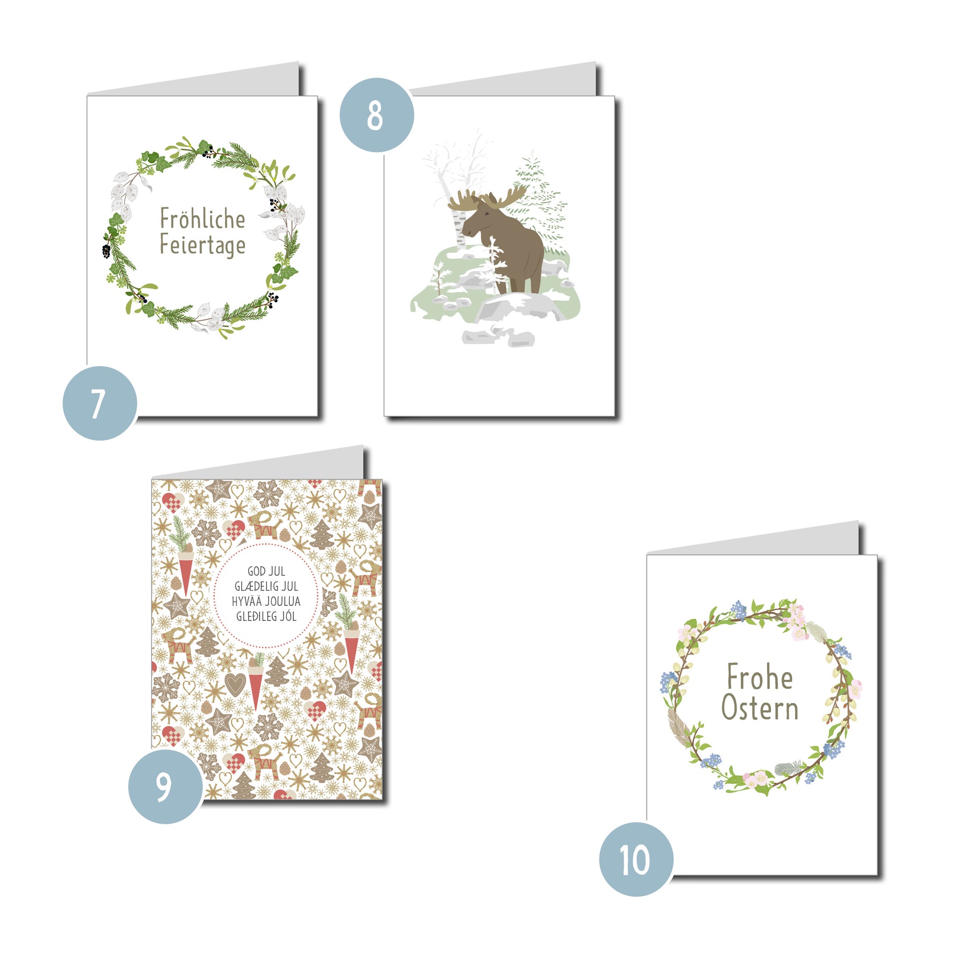 Hier kannst du dir aus dem Sortiment der Dönselfrau sechs Klappkarten aussuchen. Es müssen nicht (dürfen aber) sechs unterschiedliche Motive sein; du kannst mixen und matchen, wie du willst. Wichtig ist nur: exakt 6 Stück. Die auf den Bildern angegebenen Nummern trägst du dann einfach bei „Personalisierung hinzufügen“ ein (z.B. 2, 5, 2x7, 2x10). Viel Spaß! :)