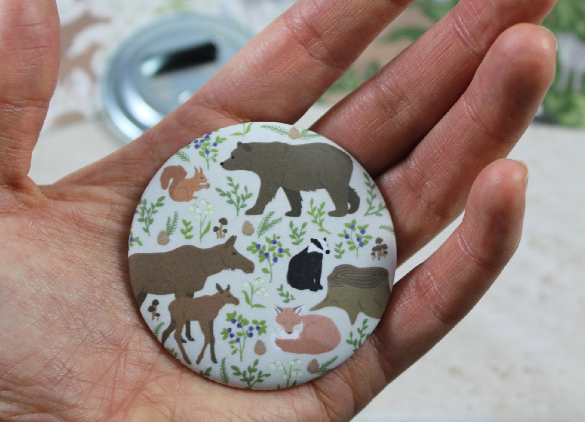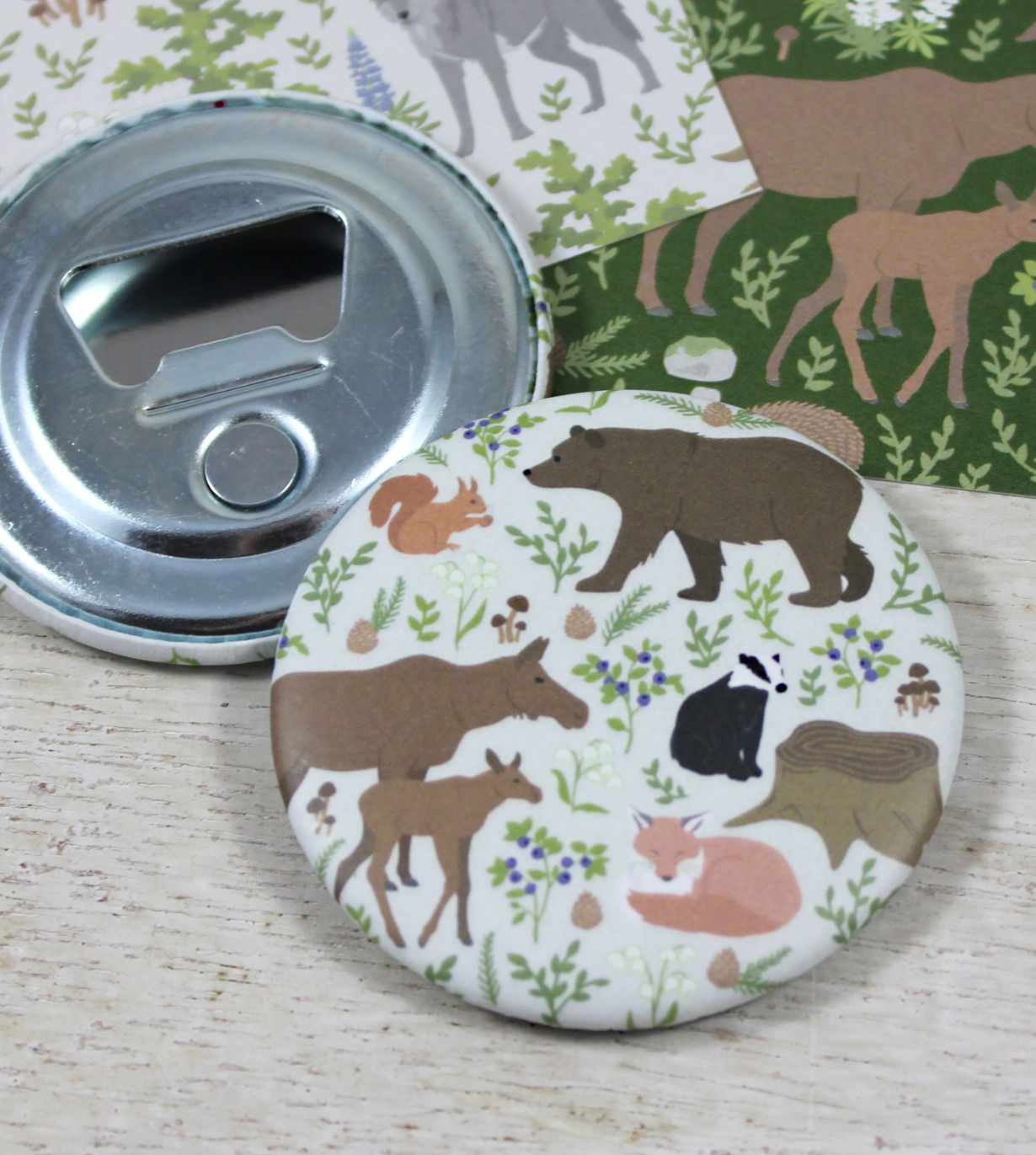 Tach! Ich bin ein Flaschenöffner für Fans nordischer Waldtiere. Auf mir findet man nicht nur Fuchs, Dachs und Eichhörnchen, sondern auch einen Bären und sogar eine Elchmama mit Jungem, nebst allerlei Flora. Abgesehen von meiner famosen Flaschenöffnefähigkeit hafte ich auch mit einer ganz brauchbaren Stärke auf allen magnetischen Oberflächen – also zum Beispiel am Kühlschrank, am Magnetboard oder am Sicherungskasten, immer direkt griffbereit für den nächsten Einsatz. Meine Beschichtung ist matt, das fasst sich schön an, sagen die Leute.
