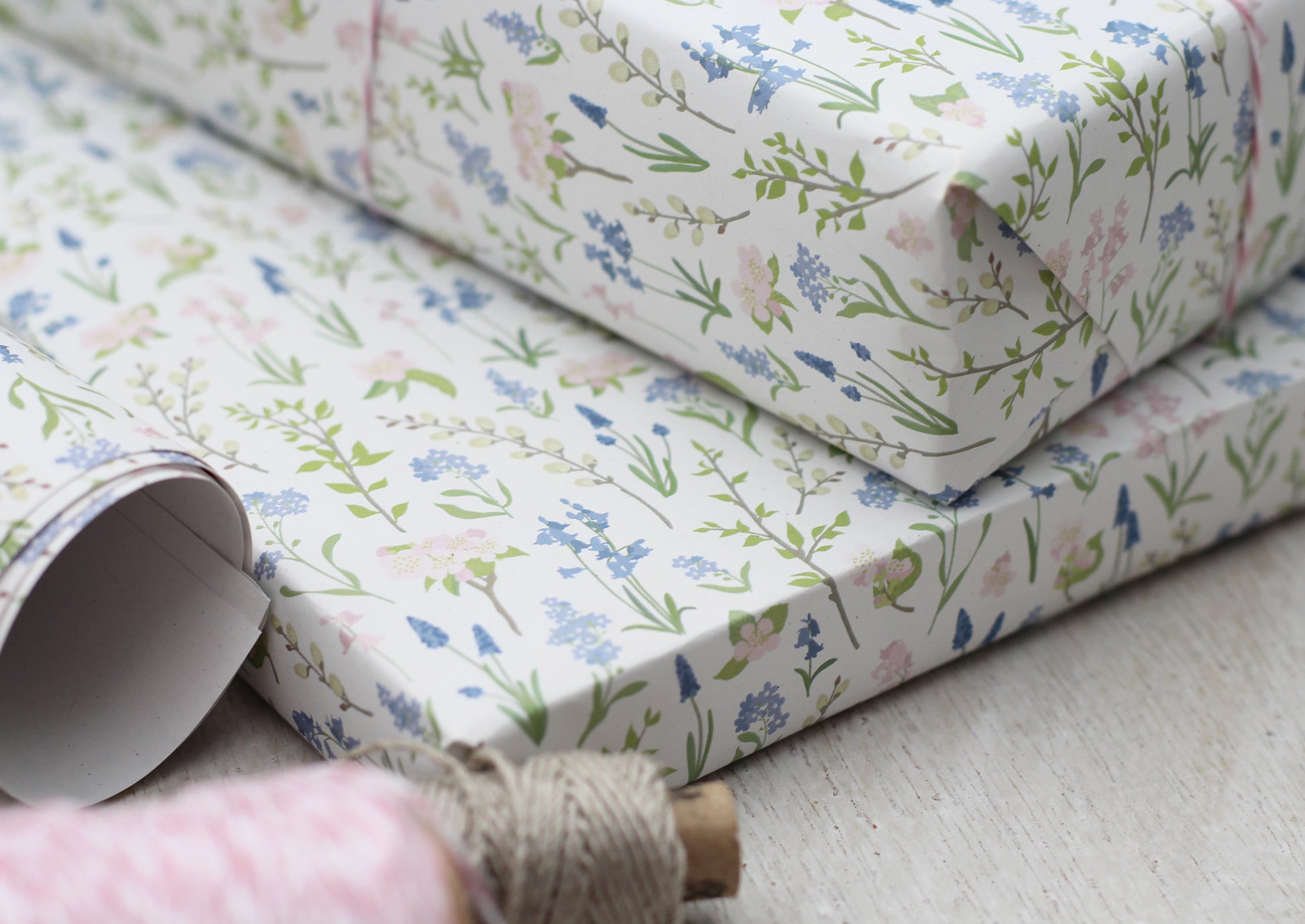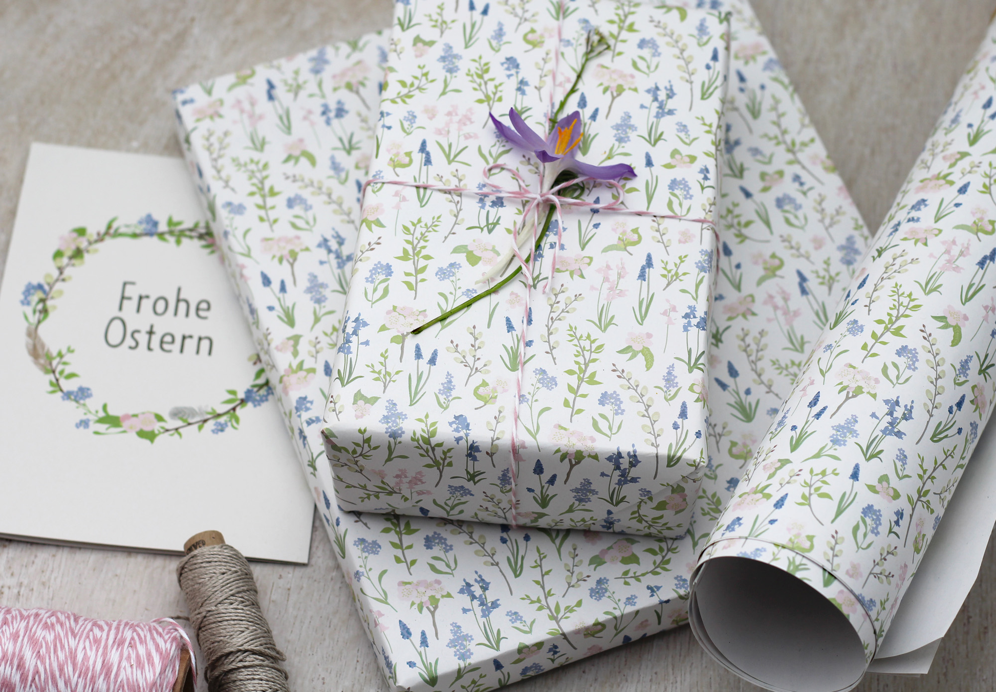 Hach, der Frühling... Alljährlich trumpft er auf mit herrlichstem Licht, zartester Beblütung und zum Hopsen verleitender Fröhlichkeit. Nur ein dilettantischer Abklatsch dessen kann ich sein, dein neues Frühlingsblumen-Geschenkpapier. Aber immerhin mit allerlei frühlingshafter Flora versehen (Zweige, Traubenhyazinthen, Obstblüten, Weidenkätzchen, Hasenglöckchen, Vergissmeinnicht), präsentiert auf fünf A3-Bögen, naturweiß, klimaneutral gedruckt mit mineralölfreien, veganen Farben auf 100% Recyclingpapier (blauer Engel).