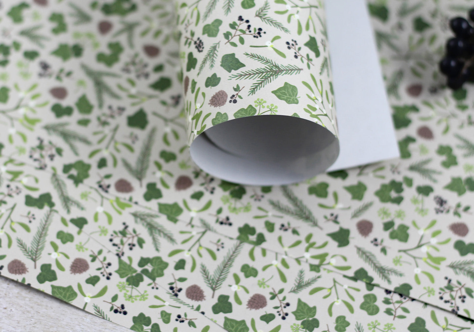 Winterflora ist ja immer so'n Ding... Man muss schon ein bisschen genauer suchen, um was Hübsches aufzutreiben. Ich hab mich im Laufe der Jahre festgelegt auf grünbobbeliges Efeu, blauschwarzbobbeligen Liguster und klassische Nadelbaumzweige, falls beschaffbar auch Misteln. Und genau diese Kombi hat es auch auf das hier angepriesene Winterflora-Geschenkpapier geschafft. Es handelt sich um fünf A3-Bögen 100%iges Recyclingpapier (blauer Engel), naturweiß, klimaneutral bedruckt mit mineralölfreien, veganen Farben.