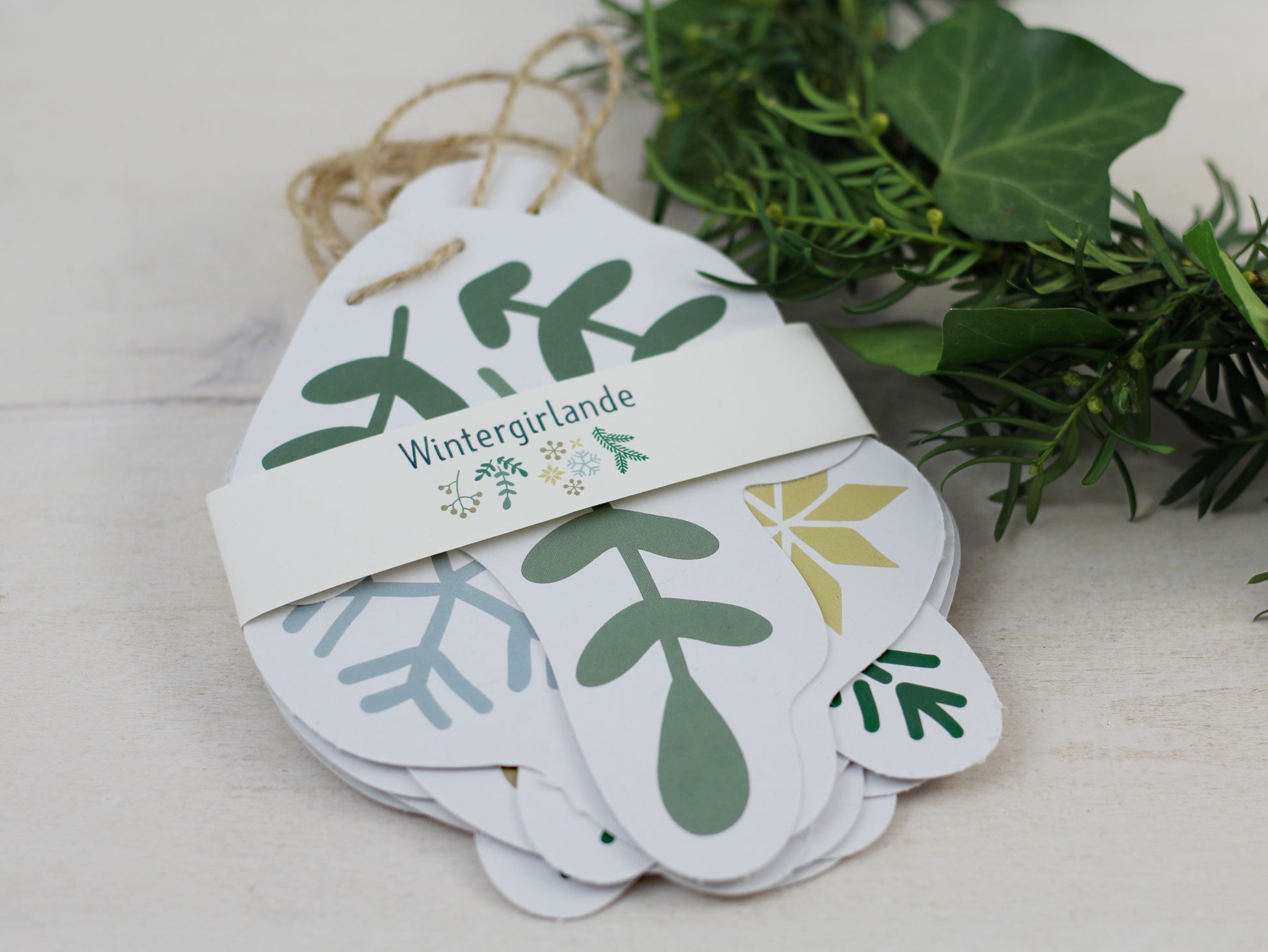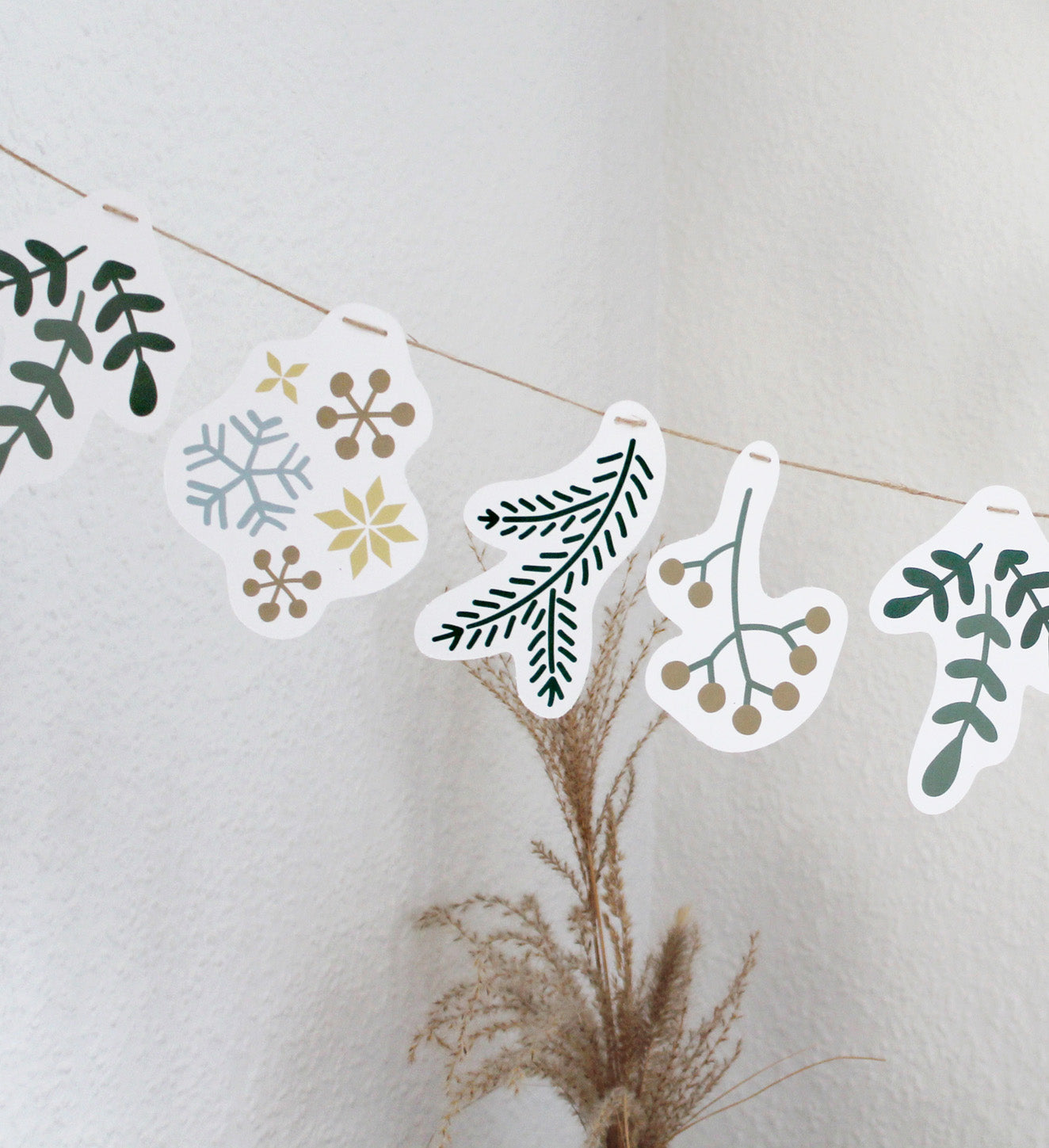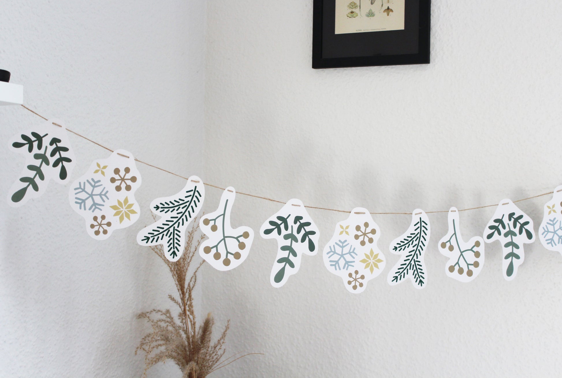 Meine dezent-floralen Motive sind auf 300g Recyclingkarton (blauer Engel) gedruckt und auf einer Juteschnur aufgefädelt. Produktionsbedingt können die Ränder der einzelnen Elemente leicht ausgefranst sein. Insgesamt bin ich so ungefähr 115 cm lang. Da der Druck doppelseitig ist, könnt ihr mich auch quer durch den Raum hängen.