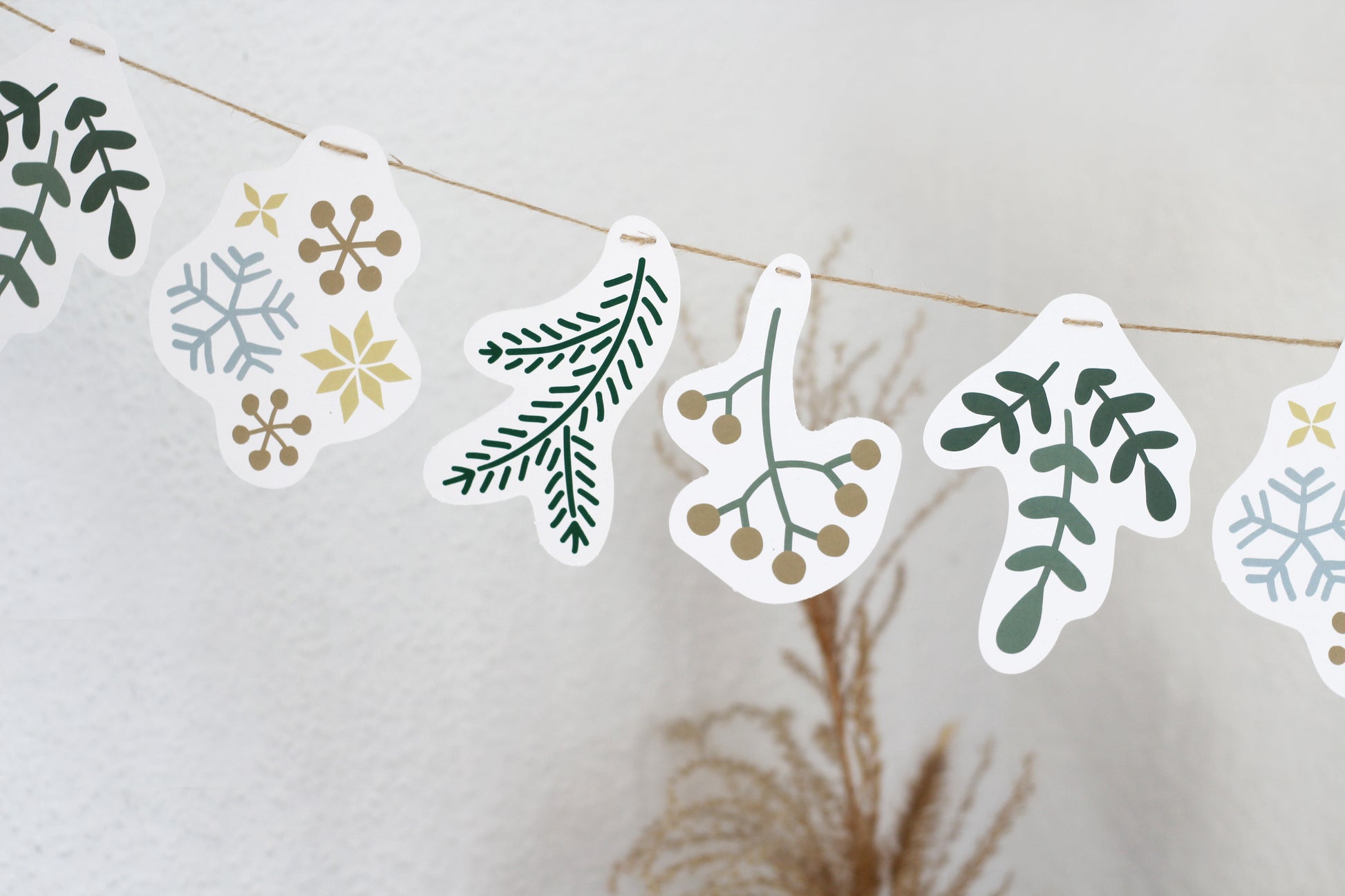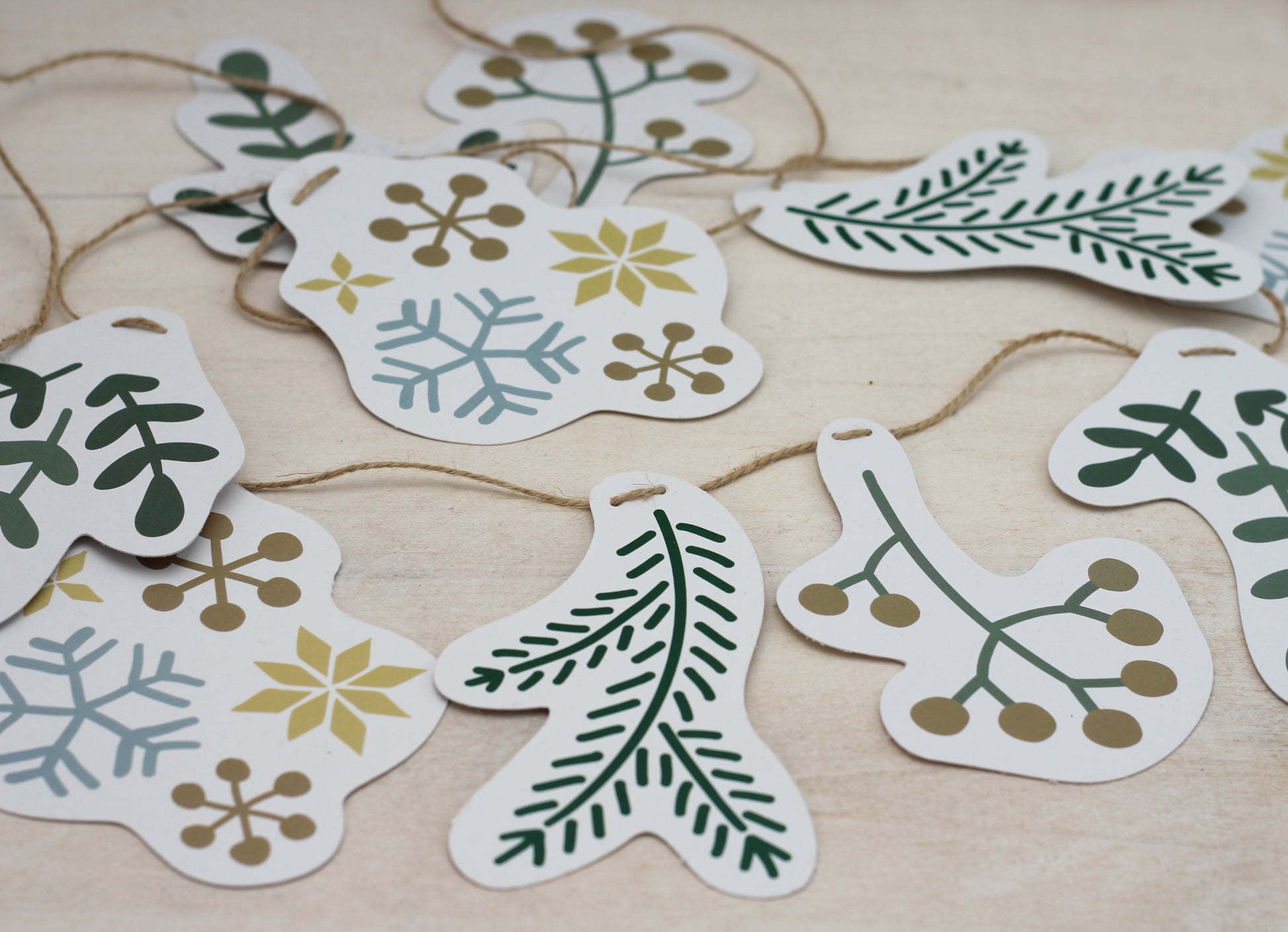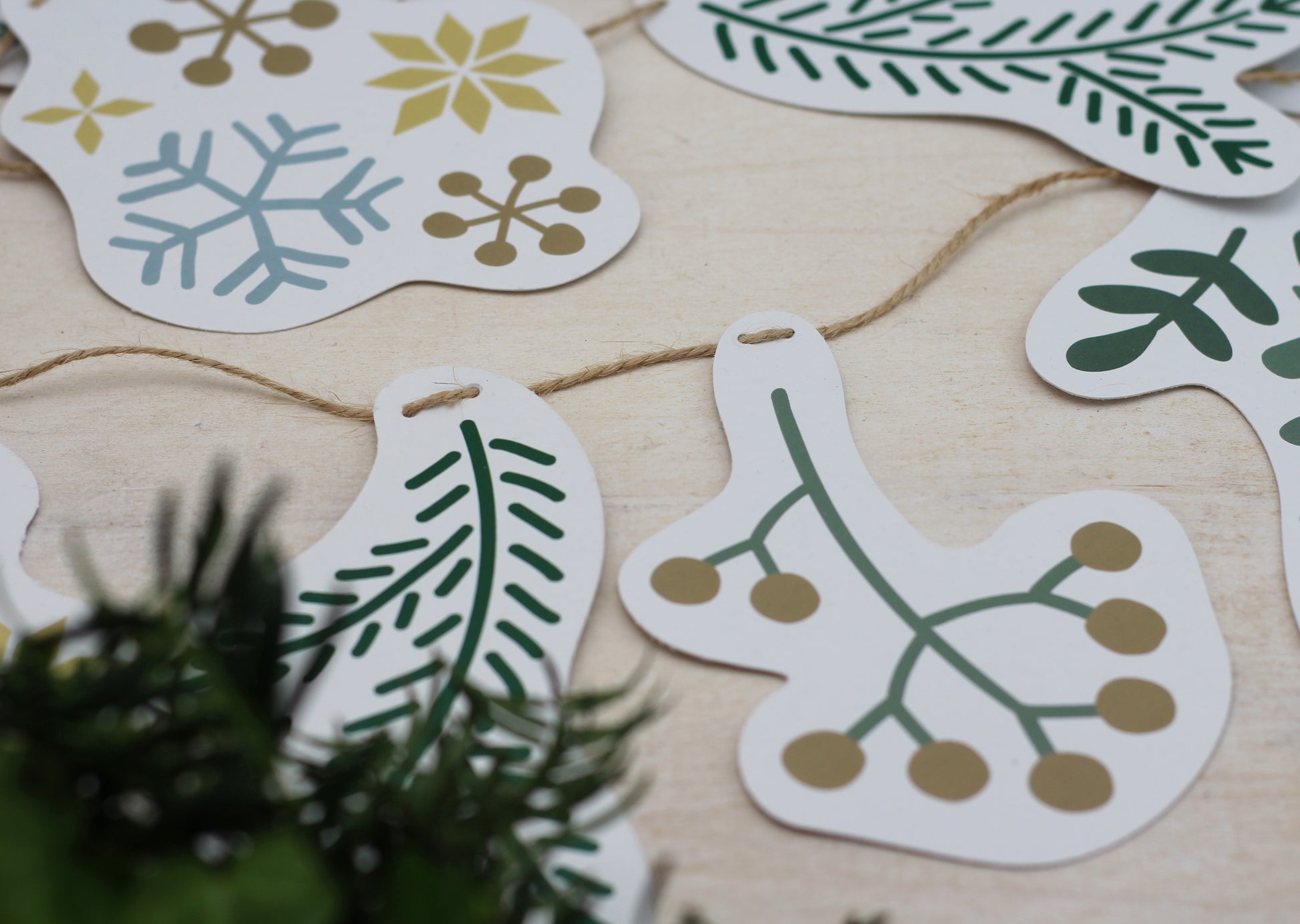 Meine dezent-floralen Motive sind auf 300g Recyclingkarton (blauer Engel) gedruckt und auf einer Juteschnur aufgefädelt. Produktionsbedingt können die Ränder der einzelnen Elemente leicht ausgefranst sein. Insgesamt bin ich so ungefähr 115 cm lang. Da der Druck doppelseitig ist, könnt ihr mich auch quer durch den Raum hängen.