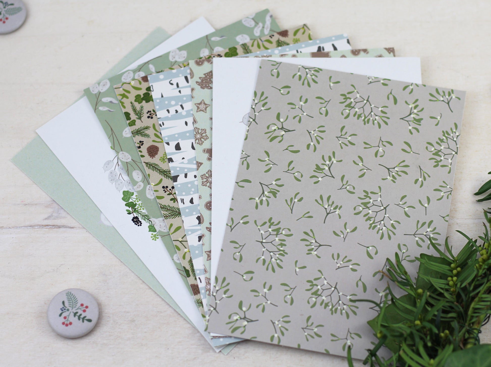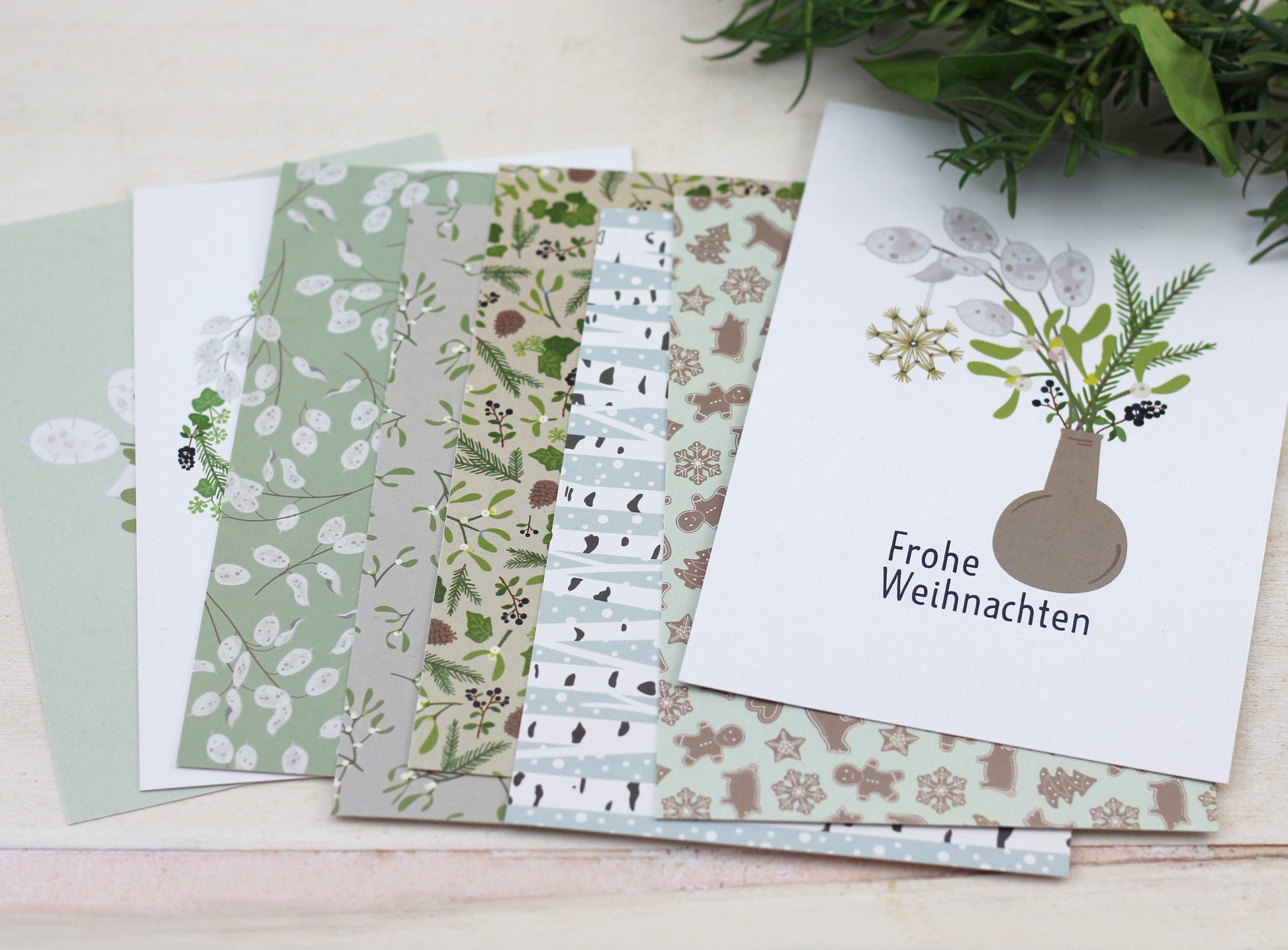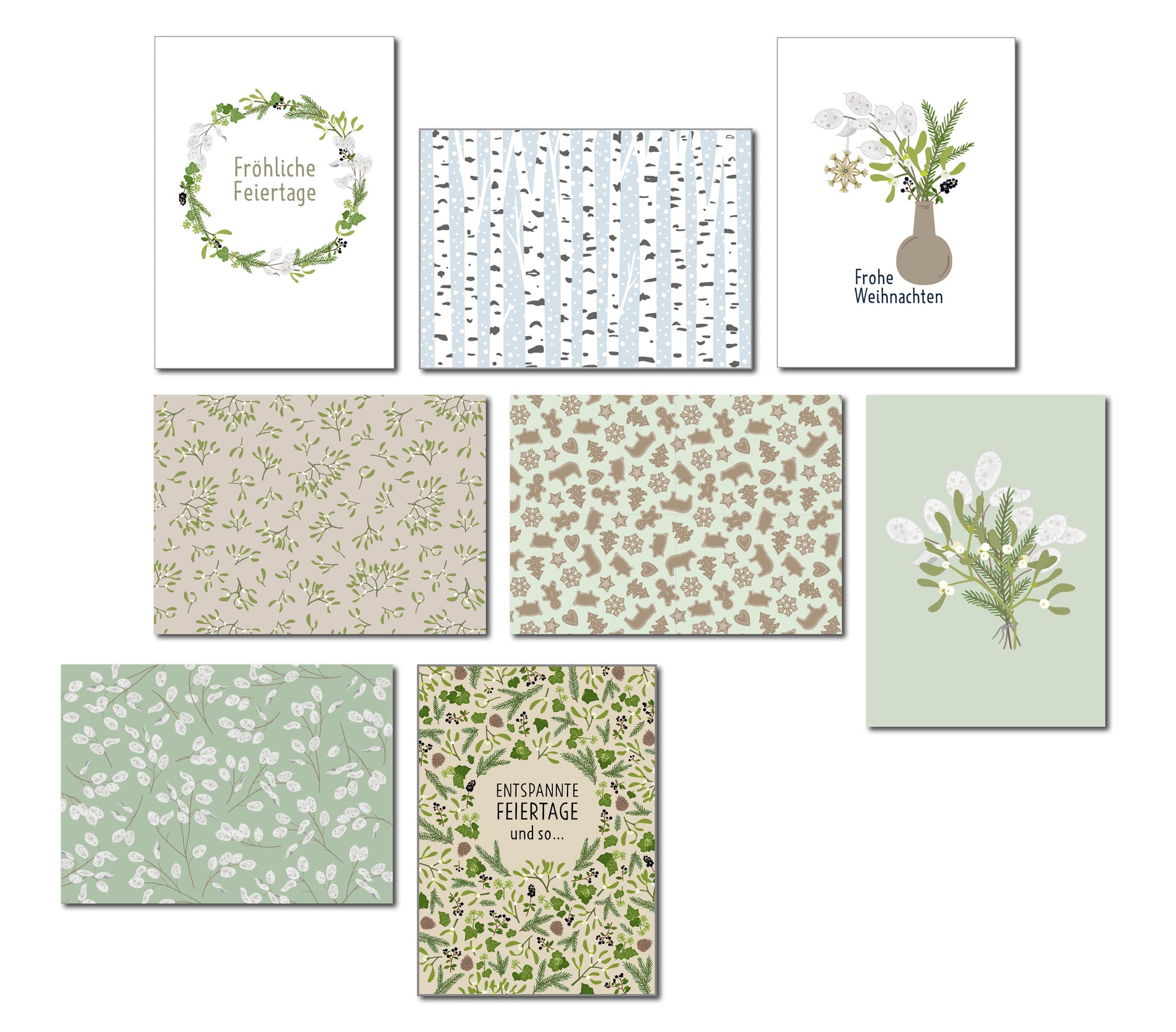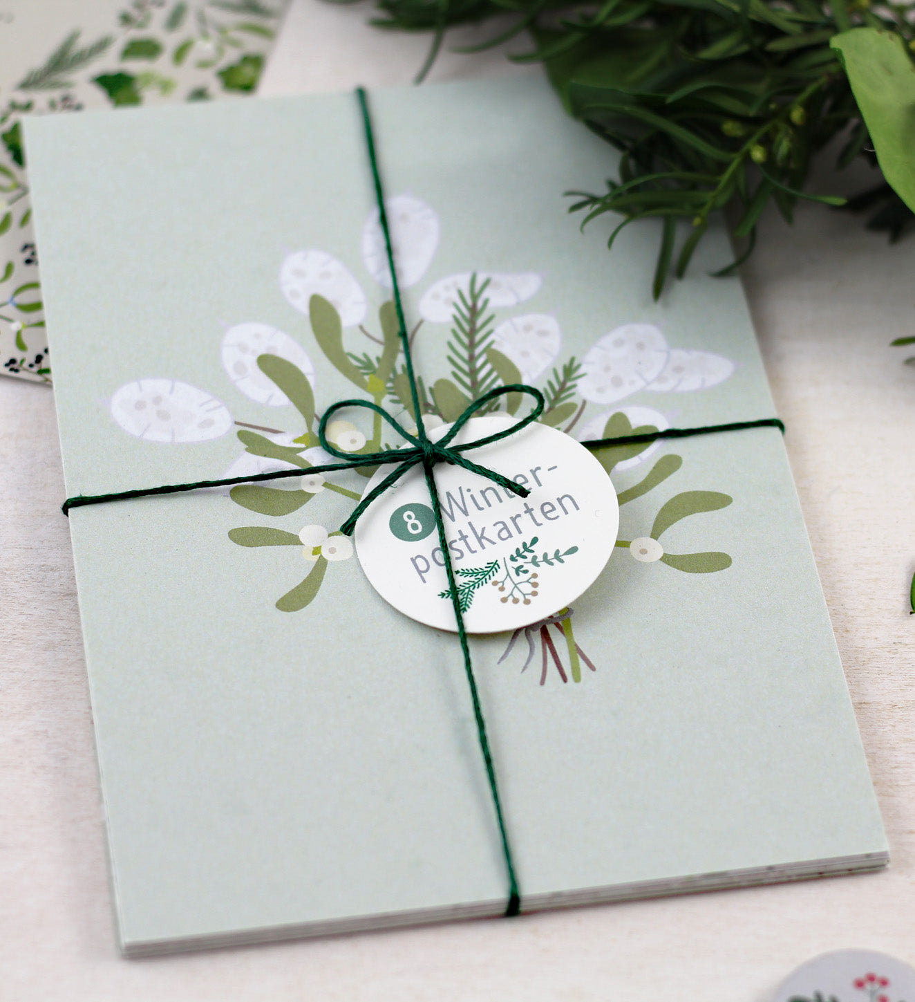Wir sind ein Set aus acht Postkarten im Format DIN A6 (10,5 × 14,8 cm) und zeigen verschiedene winterliche Motive: