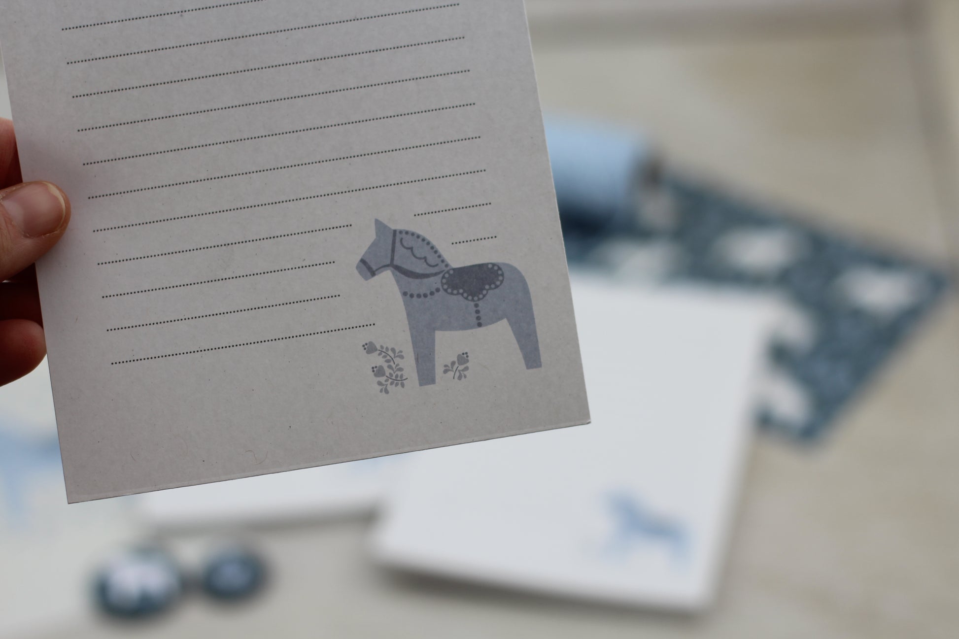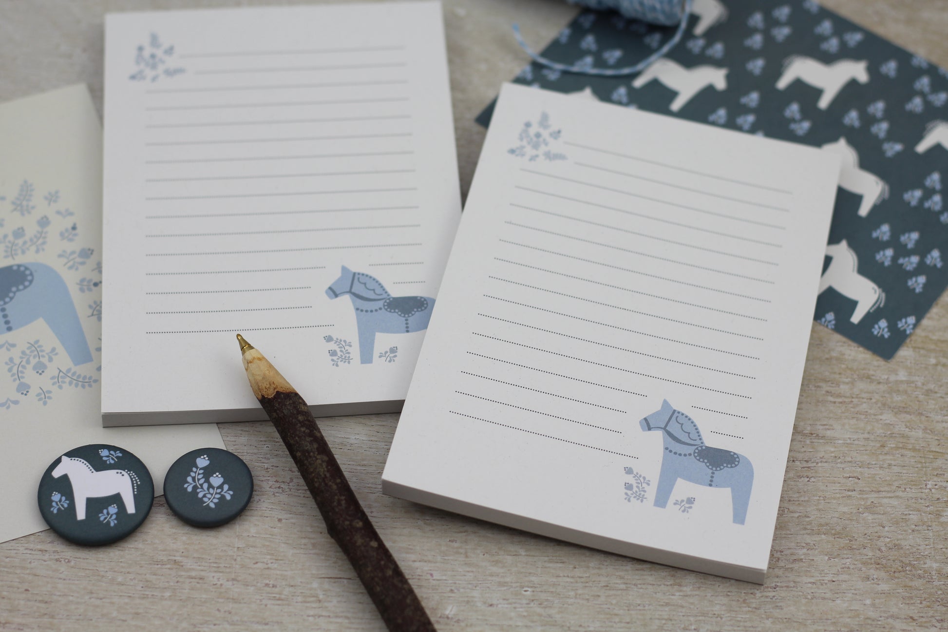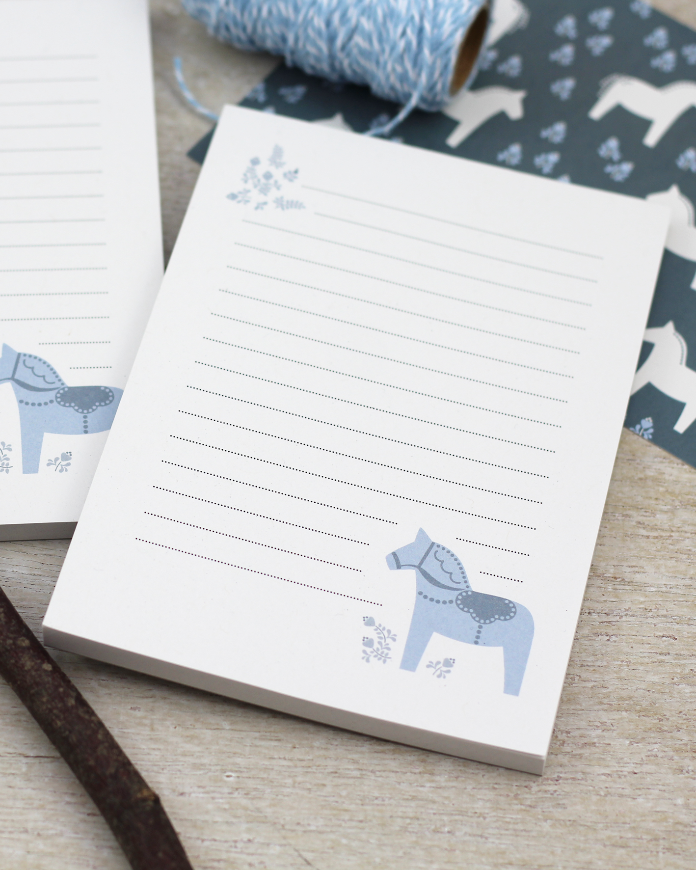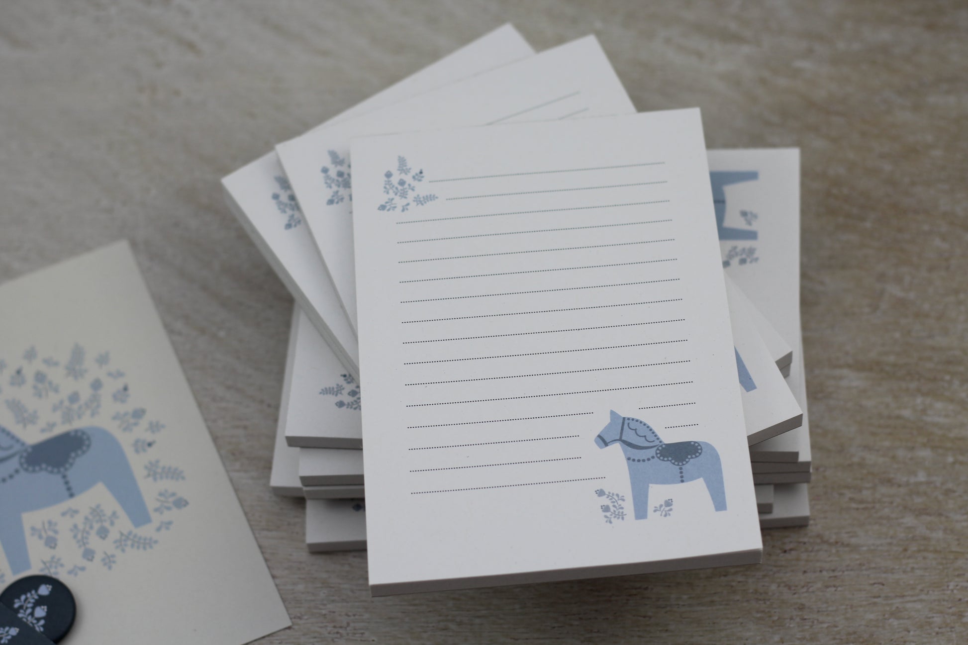 Huhu, ich bin ein Dalapferdblock! Mich ziert eine Illustration eines typisch schwedischen Dalapferdes samt folkartmäßig anmutendem Floralgedingse. Einkaufszettel oder Telefonnotizen flutschen doch gleich viel leichter von der Hand, wenn sich das Niedergeschriebene in unmittelbarer Nähe von skandinavisch interpretierbaren Minigrafiken befindet, oder?