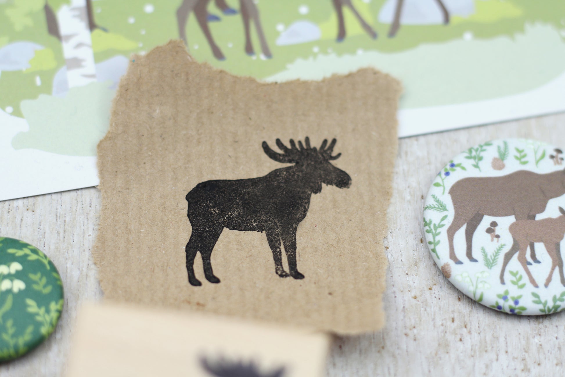 Hej, ich bin Papa Älgsson und der Chef im Wald. Glaub ich. Jedenfalls bin ich sehr groß und sehr stark. Aber auf diesem Stempel bin ich ganz klein, damit du mich ohne Platzmangel überall hinstempeln kannst, wo noch ein paar Elchvibes fehlen: in dein Tagebuch oder Scrapbook, auf einen Brief, eine Weihnachtskarte oder auf die Rückseite der nächsten Steuererklärung. Mit meinem Stempelabdruck zeigst du aller Welt deine Vorliebe für fellige, langnasige Zeitgenossen.