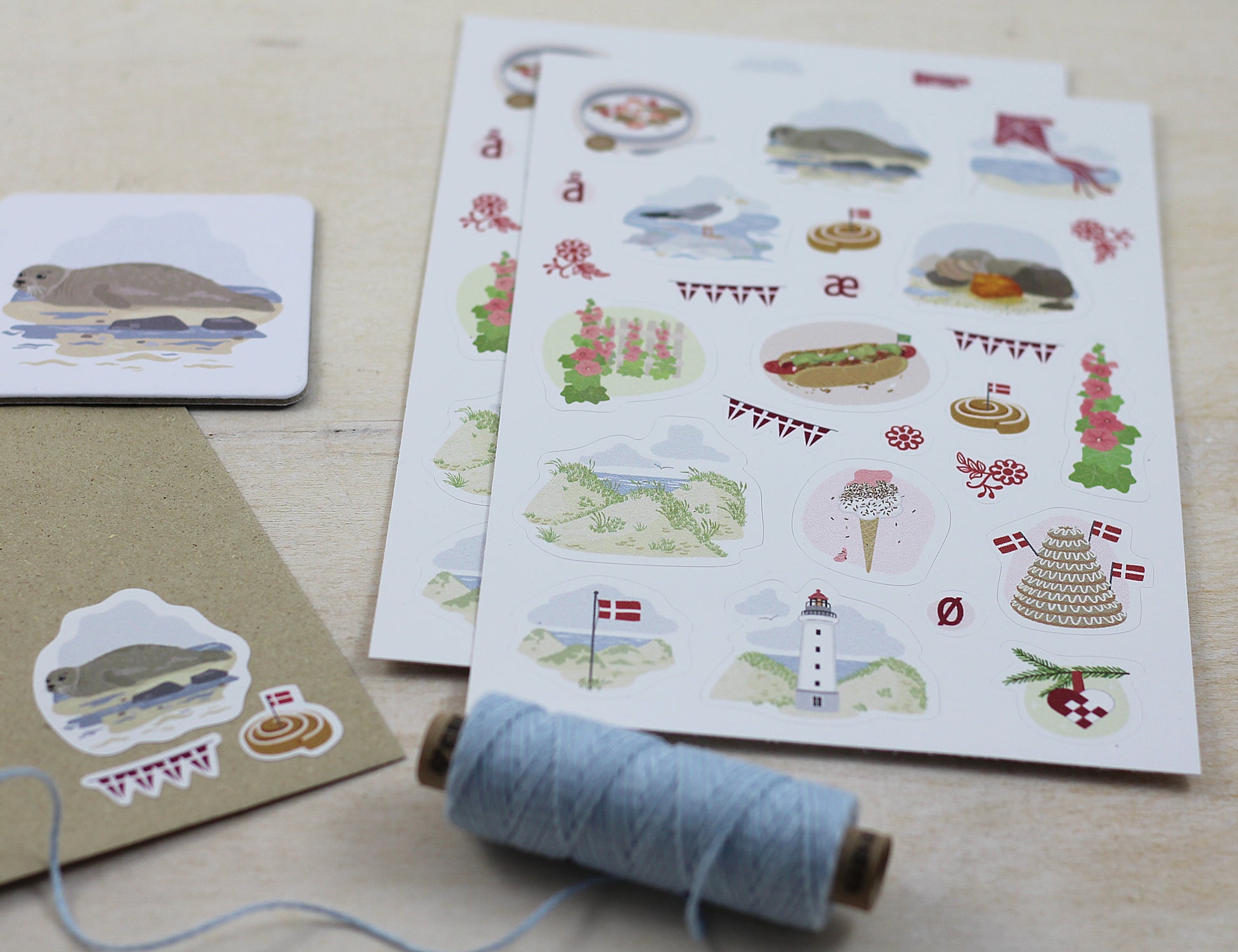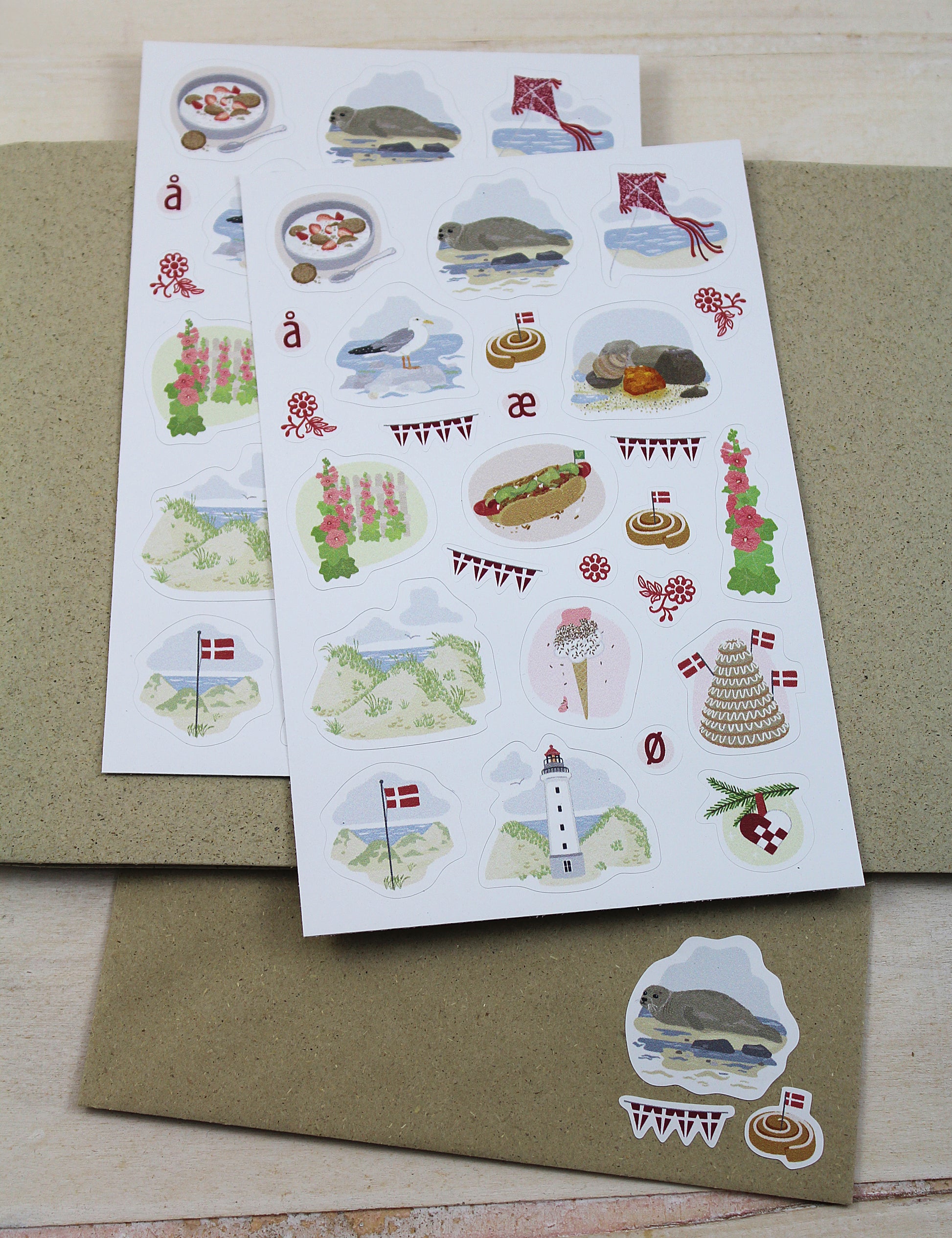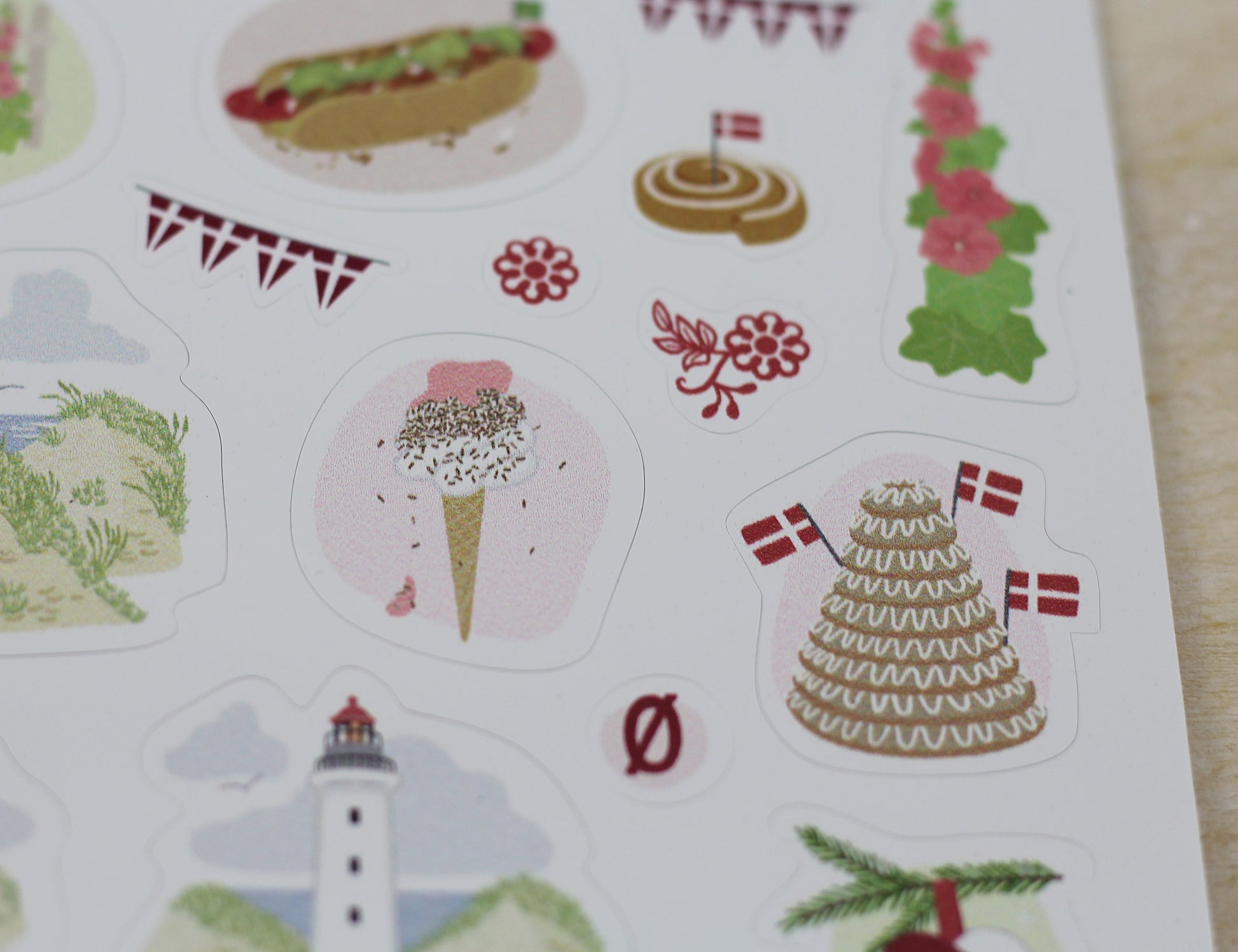 Wir sind zwei Stickerbögen (12×18,5 cm) und statten dich mit einem umfangreichen Sortiment unverkennbar dänischer Bildchen aus, wie bspw. Dünen, einem Hotdog oder einer Stockrose. Wenn man da nicht direkt gute Laune bekommt, wissen wir auch nicht ...!