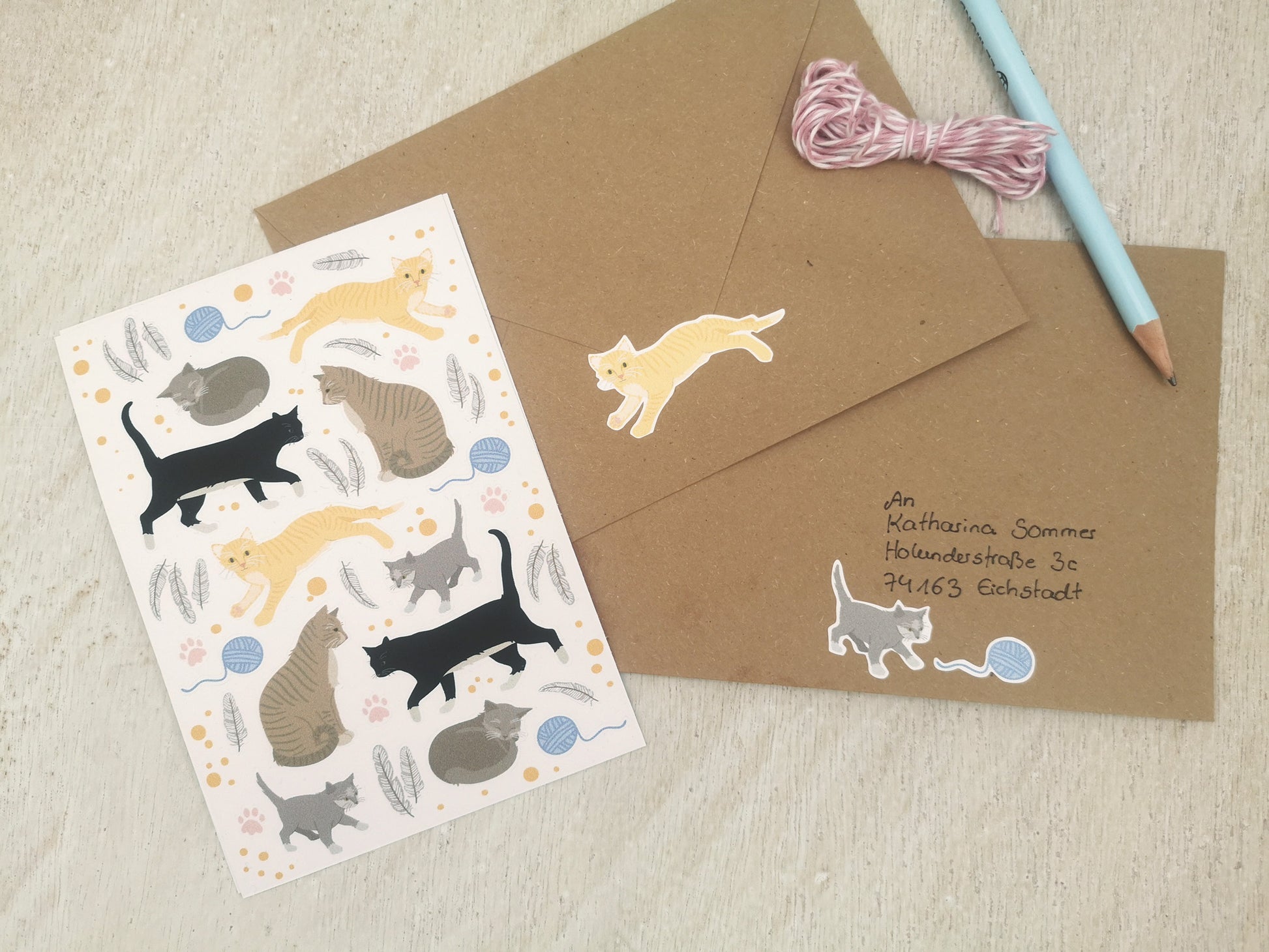 Wir sind zwei Stickerbögen (A6) mit verschiedenfarbigen Katzen und ein bisschen Gedöns wie Tatzen(-abdrücken), Wollknäuel und Federn.
