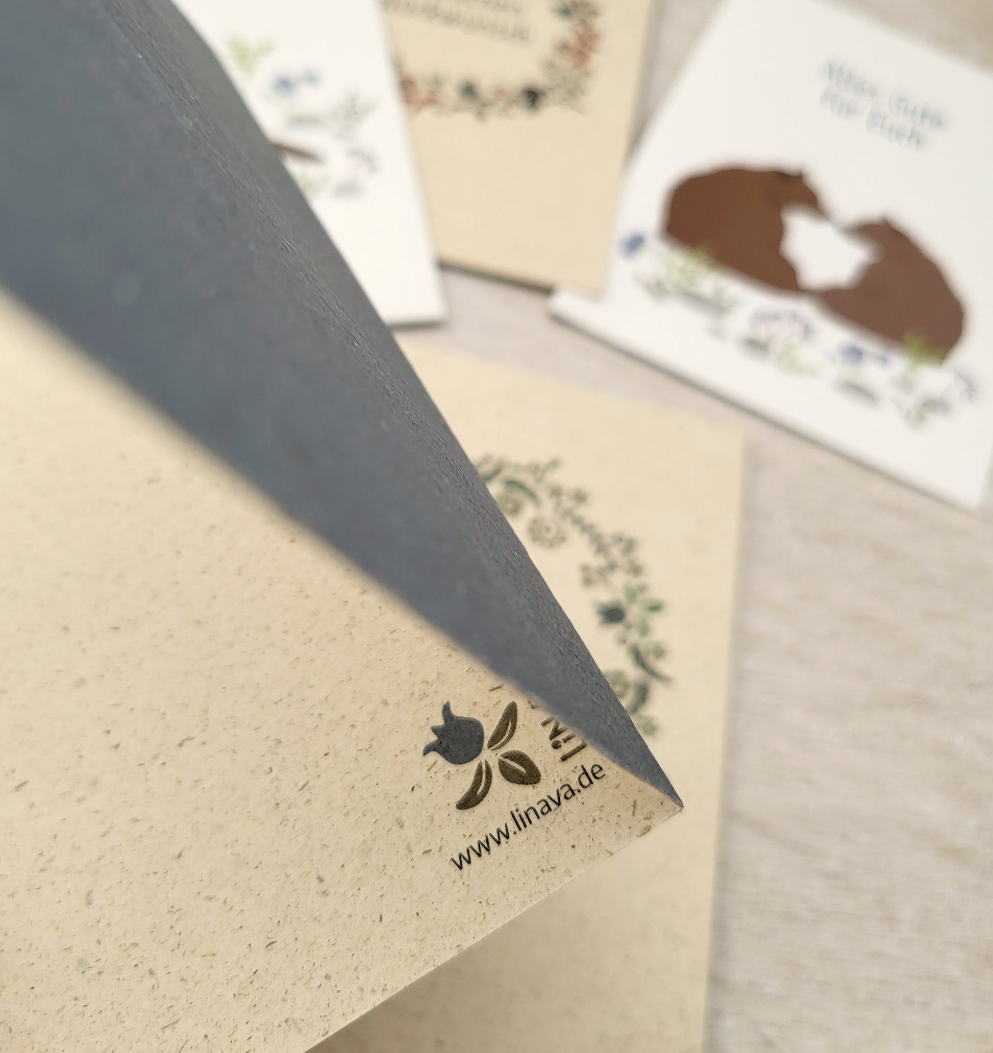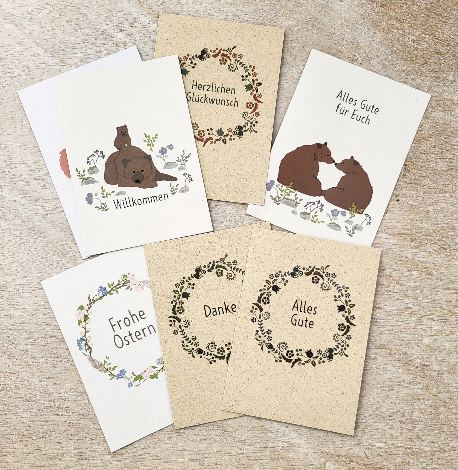 Die Karten 1 – 3 bestehen aus Graspapierkarton mit ca. 50 % Grasfasern und 50 % FSC-Zellstoffen. Alle anderen Karten sind auf 100% Recyclingkarton gedruckt.