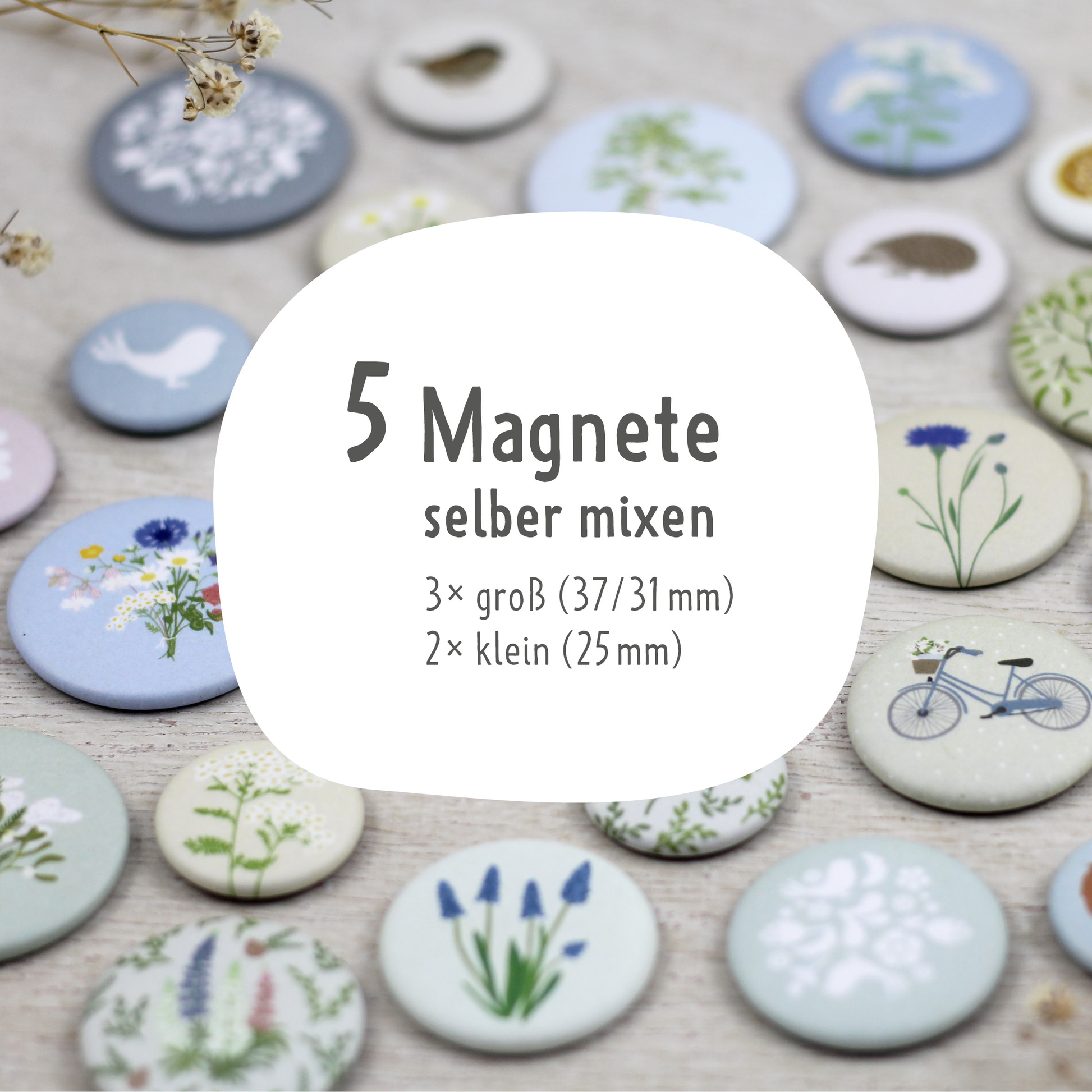 Hej, ich bin das 5-Magnete-Mixset. Das läuft hier wie bei Beleg-dir-deine-Wunschpizza: Such dir einfach aus dem gesamten Sortiment drei große (37 oder 31 mm) und zwei kleine (25 mm) Magnete aus! Es müssen nicht (dürfen aber) fünf unterschiedliche Motive sein; du kannst mixen und matchen, wie du willst. Hauptsache, drei große und zwei kleine. Notiere dir die Nummern deiner Lieblingsmotive und gib sie dann im Warenkorb einfach bei „Anmerkung“ ein. Ich bin gespannt auf deinen persönlichen Mix! Viel Spaß! :)
