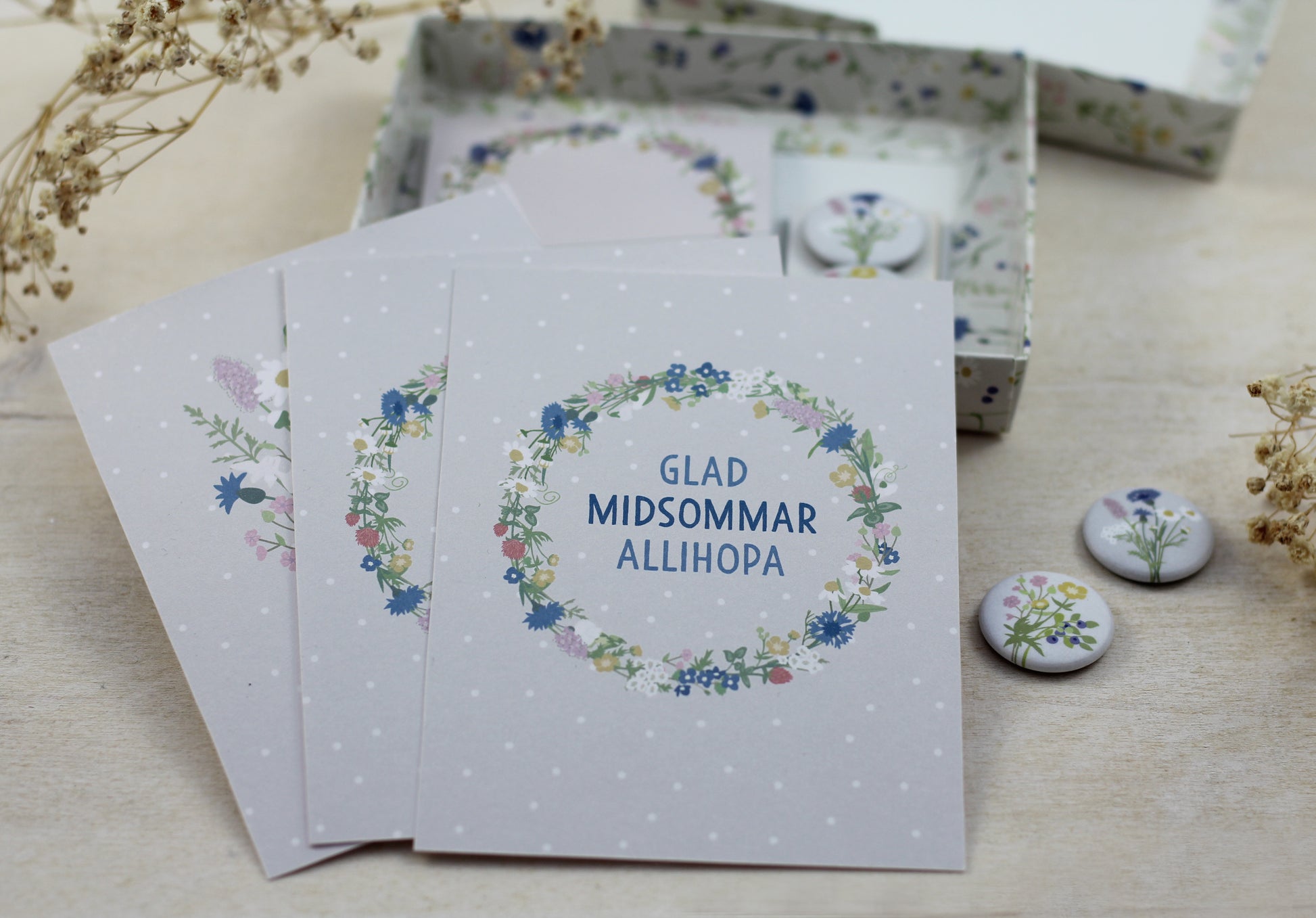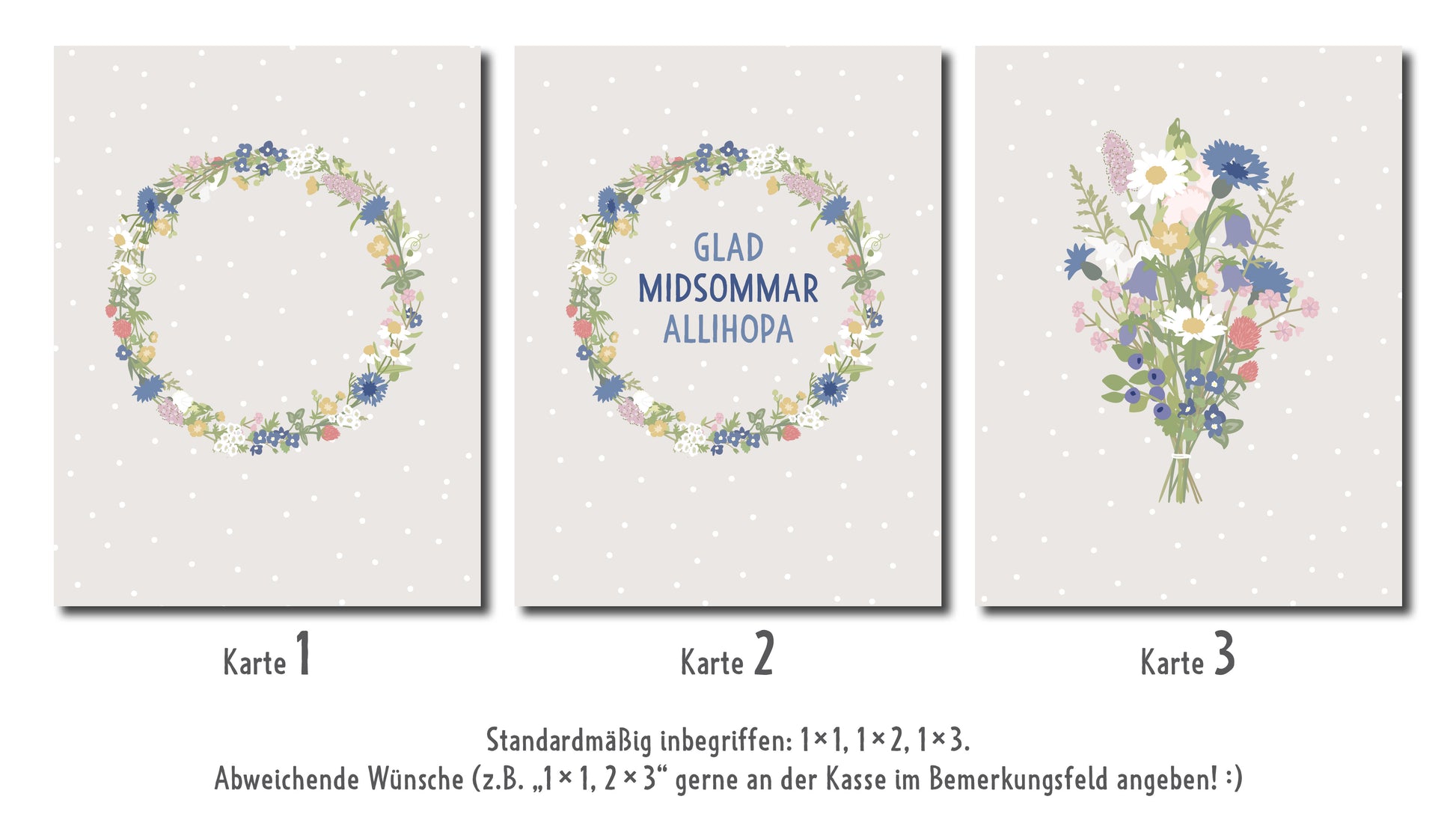 Bei den Karten hast du die Wahl: Standardmäßig gibt es einen neutralen Kranz. einen Kranz mit Midsommargruß und ein Sträußchen. Du kannst aber auch gerne deine Wunschkarten-Kombi ins Bemerkungsfeld schreiben (wenn du z.B. keinen Midsommarspruch möchtest), dann wird das berücksichtigt.