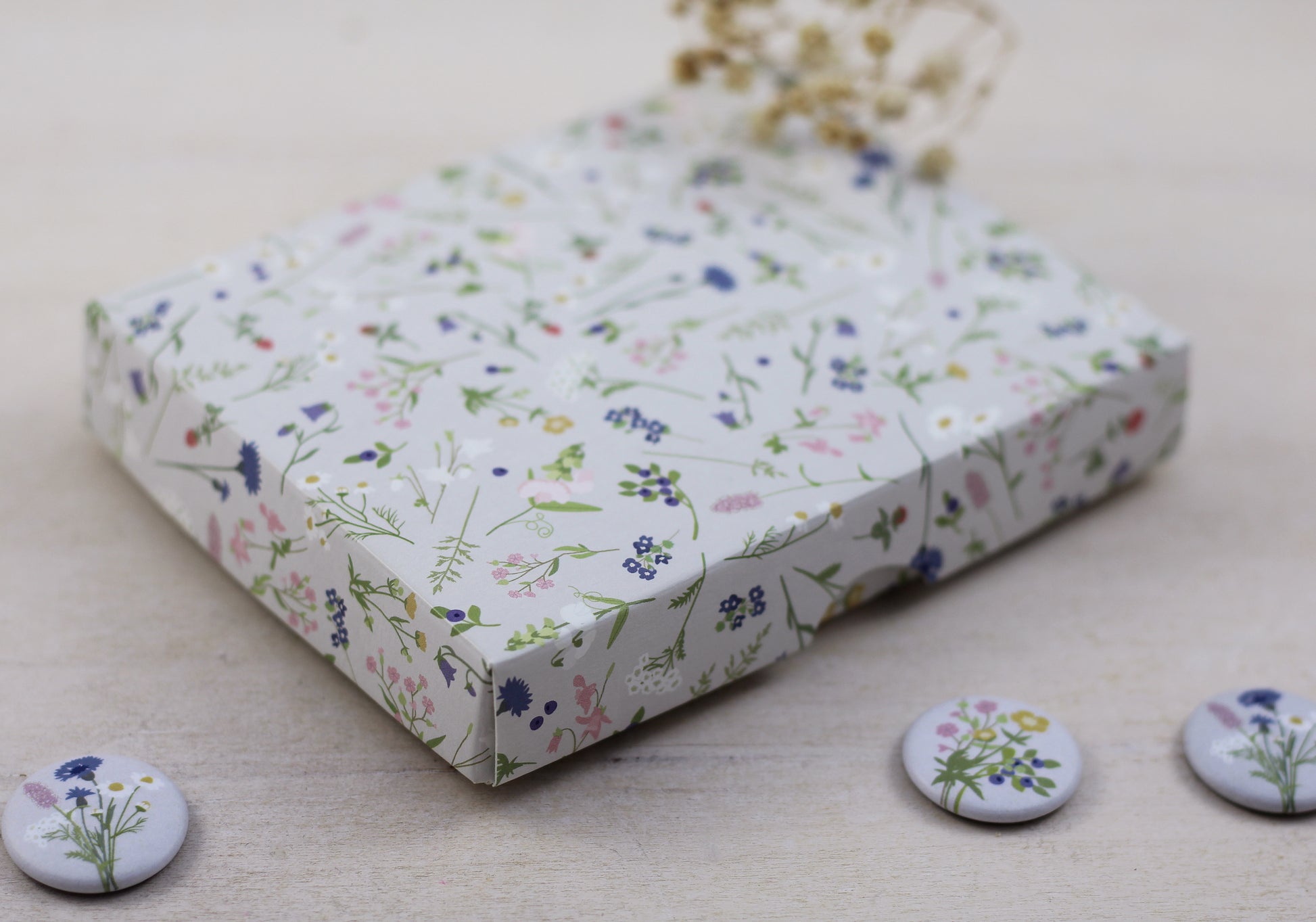 Aber von vorne: Ich bestehe aus einer adrett geblümten Stülpdeckelschachtel (9,3 × 12,4 × 2 cm) mit folgendem Inhalt: