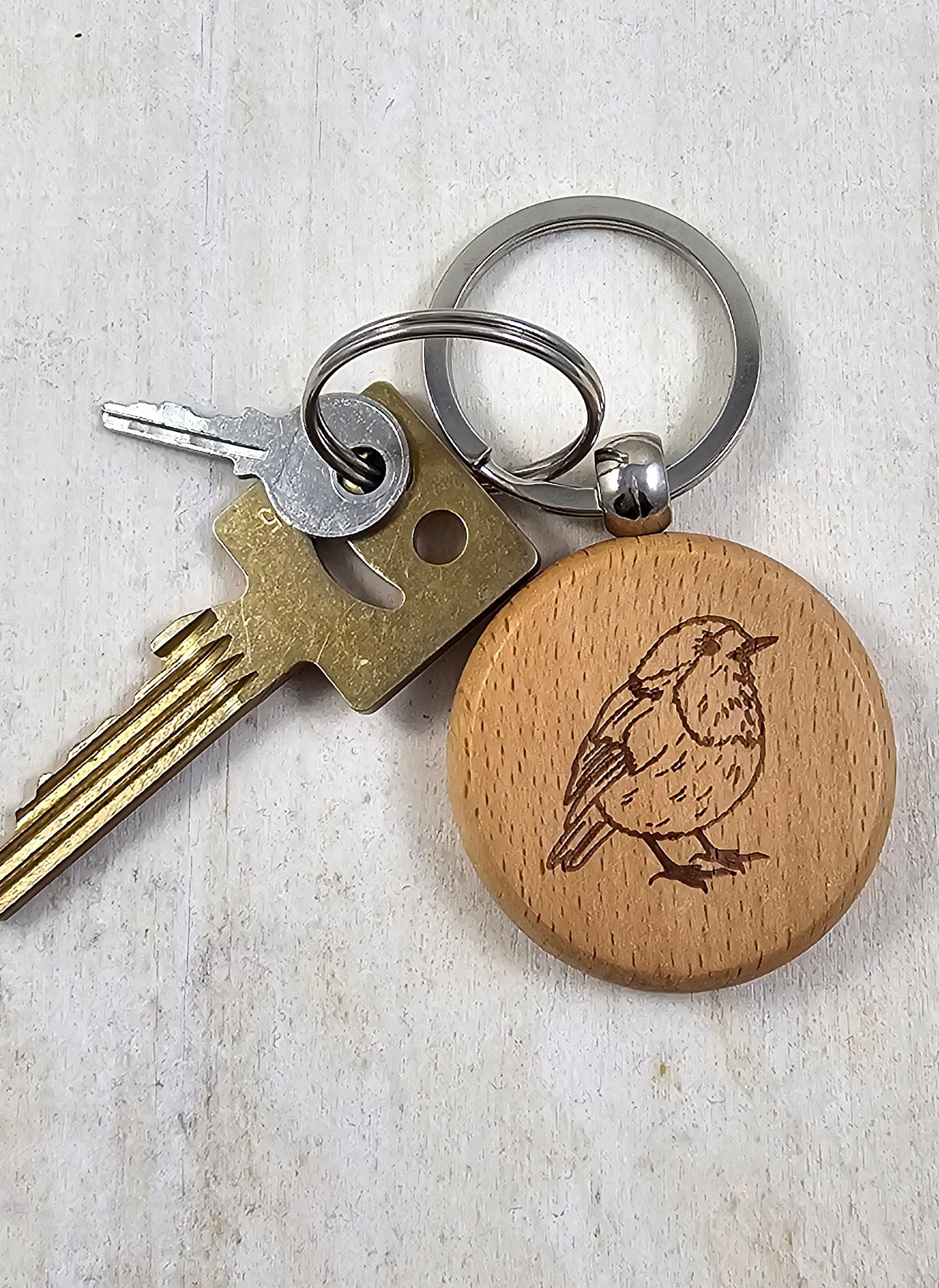 Ich bin doppelseitig lasergraviert auf ein handliches, leichtes Stück Buchenholz und gleichermaßen bereit für lustige Ausflüge oder einfach nur entspanntes Abhängen. Wer also Schlüsselbundverschönerung mit einem klaren Statement für süße Vögelchen verbinden möchte, für den bin ich gerne das neue unverzichtbare Fashionpiece! :)