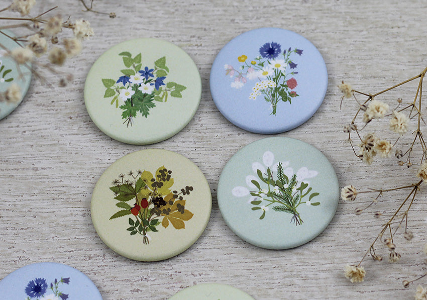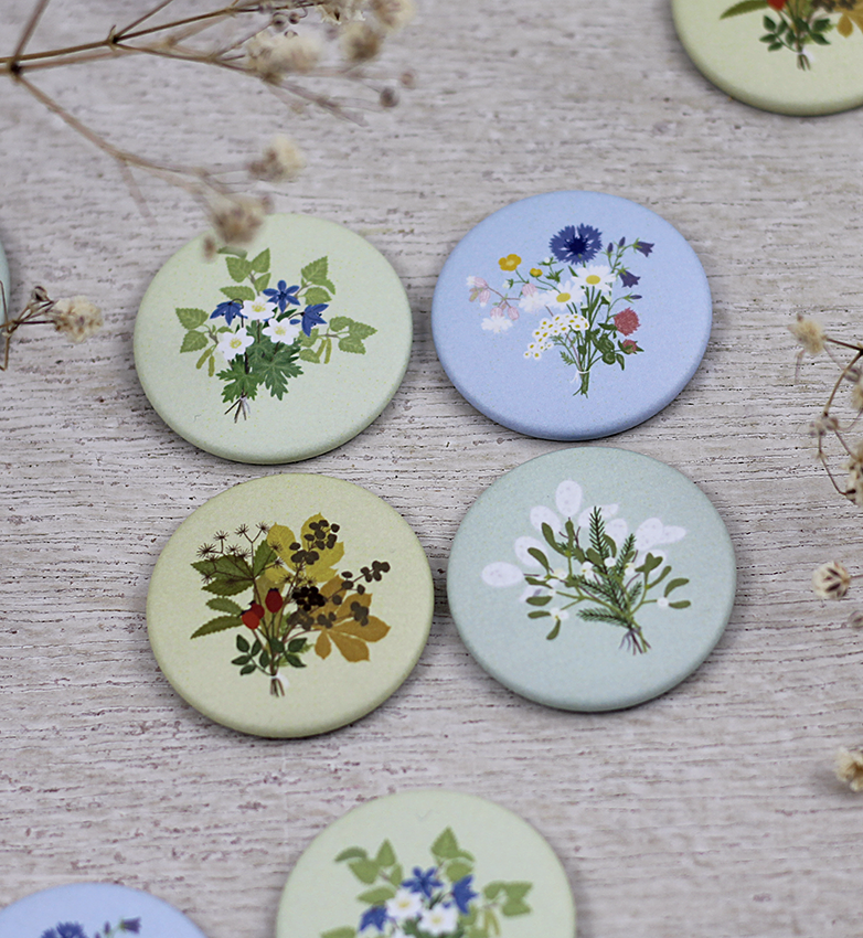 Wir sind ein Set aus vier runden Magneten mit je 3,7 cm Durchmesser und zeichnen uns dadurch aus, dass wir für jede Jahreszeit ein kleines florales Sträußchen bereithalten.